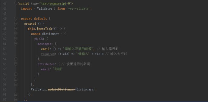 其中field获取的是attributes中的email的value值,也就是'邮箱'。vee-validate提供了一些规则,具体可以去vee-validate官网查看。