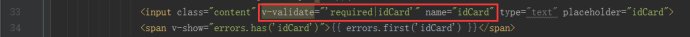 如果需求里不需要多一个提示的标签,只需要在错误验证时显示警示颜色,那可以通过在input标签上写:class="{error:error.has('idCard')}"来实现。至此已经可以满足基本的验证需求了,更多的vee-validate插件功能会在往后更新完善,希望对大家有帮助。