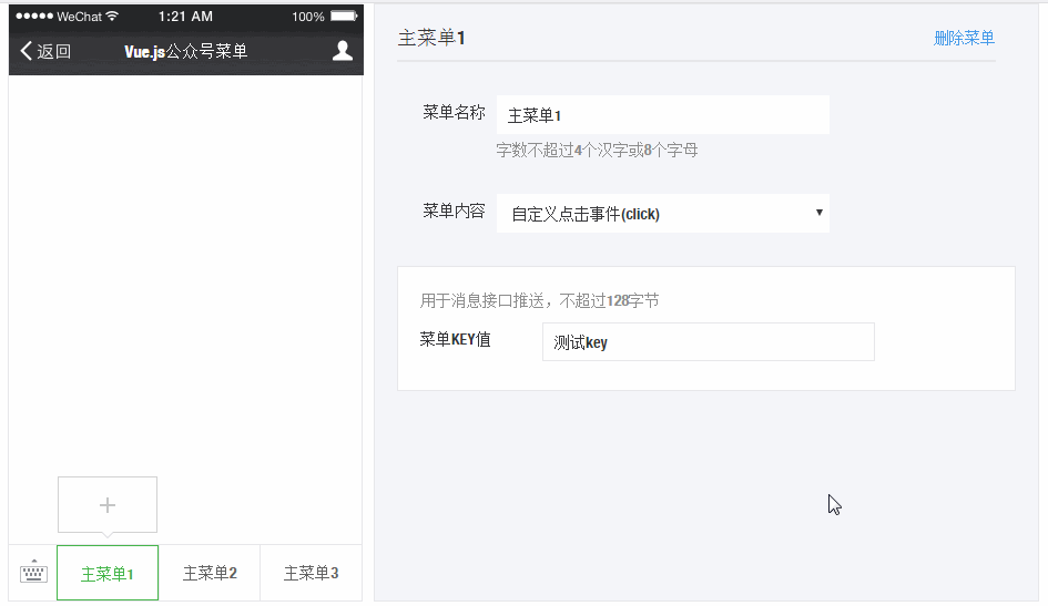 以上所述是小编给大家介绍的Vue.js 实现微信公众号菜单编辑器功能(二),希望对大家有所帮助,如果大家有任何疑问请给我留言,小编会及时回复大家的。在此也非常感谢大家对脚本之家网站的支持!