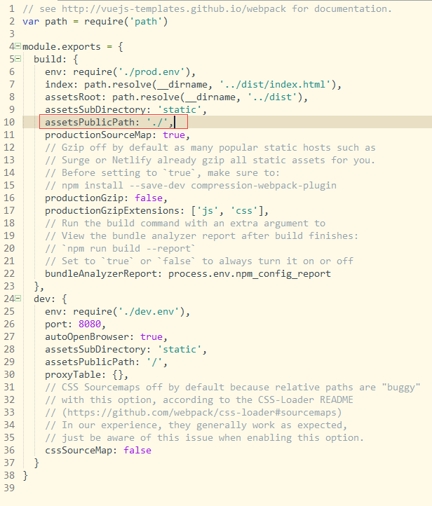 这两种命令的配置文件在config的index.js 一种是build 一种是dev ,而我们想要在本地查看打包后的成果,需要在assetsPublicPath 改变它的路径, 具体为什么,可以看index.html引入的文件路径