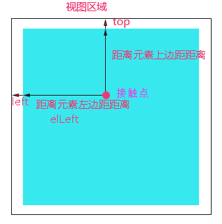 •开始拖动时:获取到接触点相对于整个视图区的坐标clientX,clientY;获取元素距离视图上侧和左侧的距离 initTop,initLeft;计算接触点距离元素上侧和左侧的距离 elTop = clientY - initTop, elLeft = clientX - initLeft;