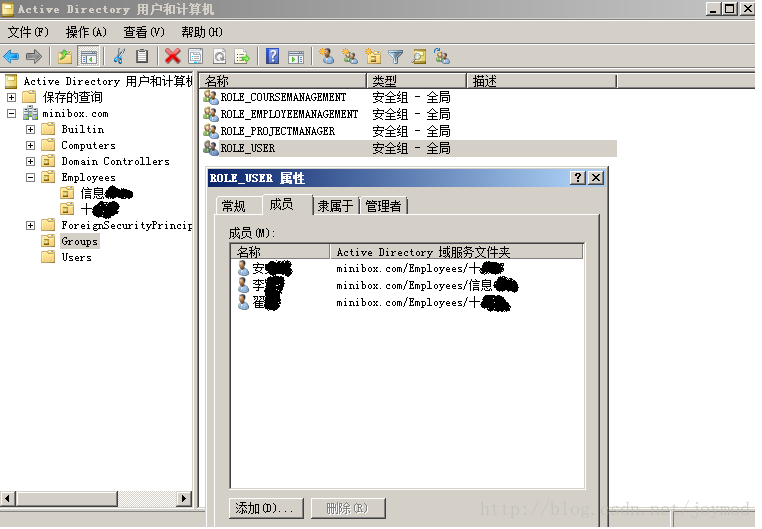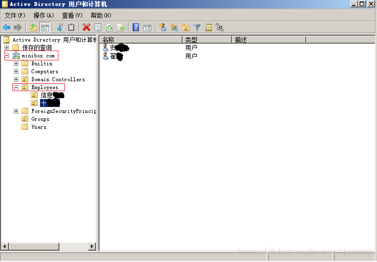 1.首先你需要一个Ldap,我使用的是AD。这里我建立了一个叫minibox.com的域,并且添加了一个Employees的OU,其中有2个子OU,子OU中创建了2个用户。