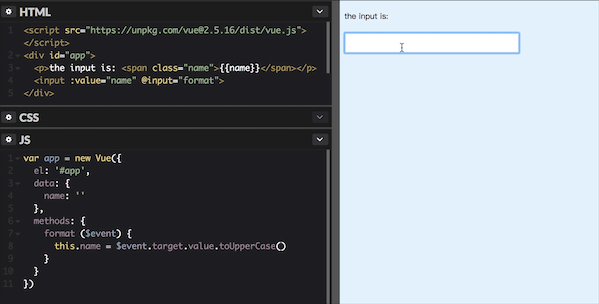 <input :value="name" @input="name = $event.target.value"><input v-model="name">