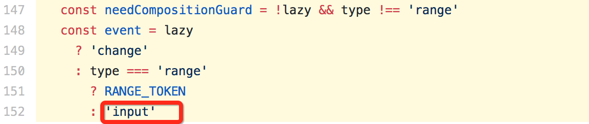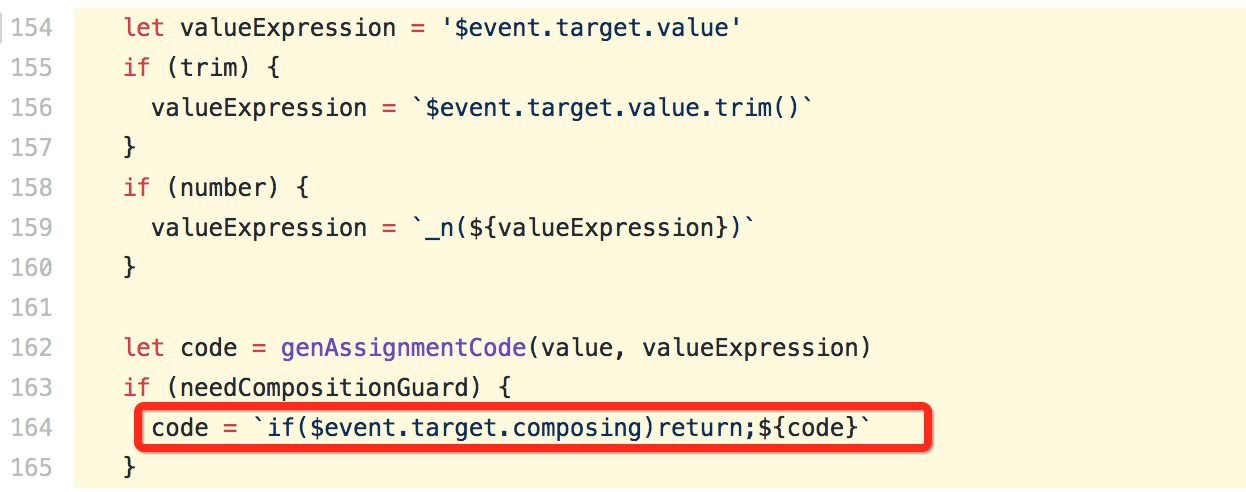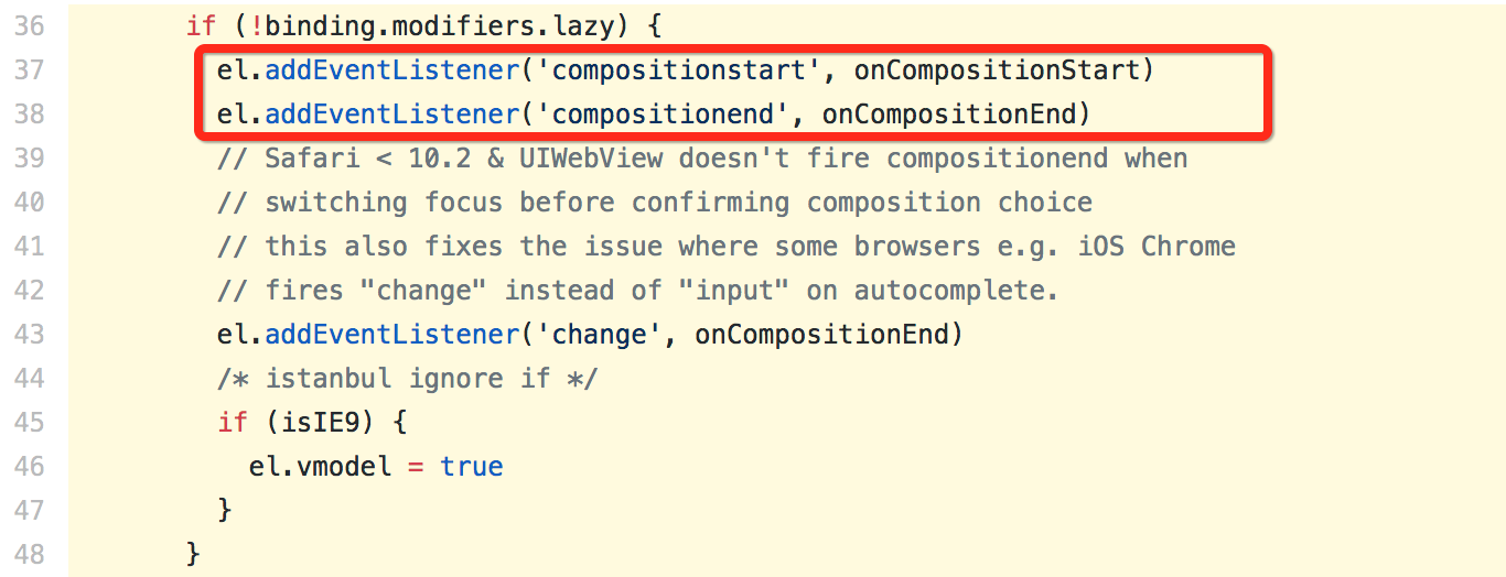 那么,是什么地方调用了这2个函数呢?可以看到,在插入dom节点时,vue.js 监听了 compositionstart / compositionend 事件: