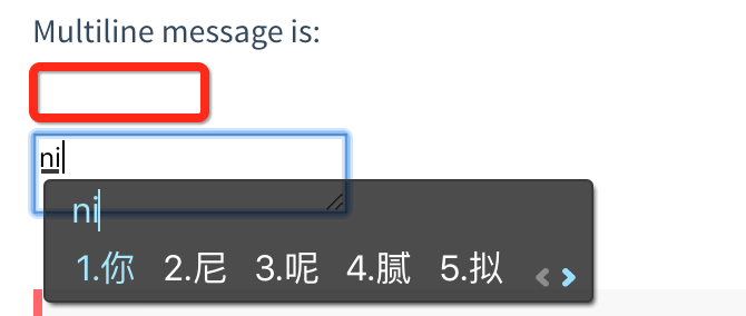 再次看下文章开头的示例,如果使用 :value, @input 实现数据双向绑定,有两个方案可以解决中文输入异常的问题。