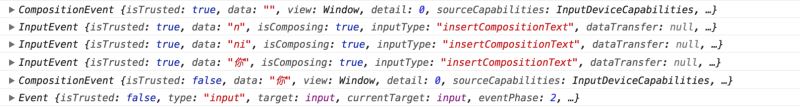 compositionstart => 3个 input => compositionend 事件,这些都是 <input>控件触发的。最后一个 input 事件,是源代码里面看到的 onCompositionEnd 回调里面 vue.js 触发的。