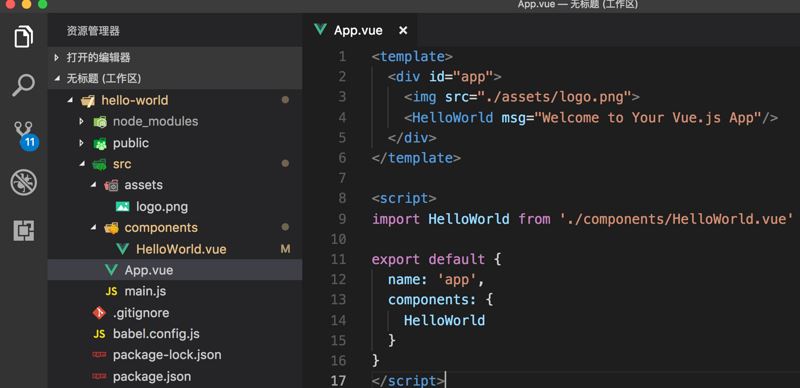 紧接着,我们需要打开你擅长的编辑器,这里我选用的是VSCode,顺手将项目导入进来,你会看到最原始的一个项目工程目录,里面只有一些简单的项目构成,还没有vue-loader的配置文件: