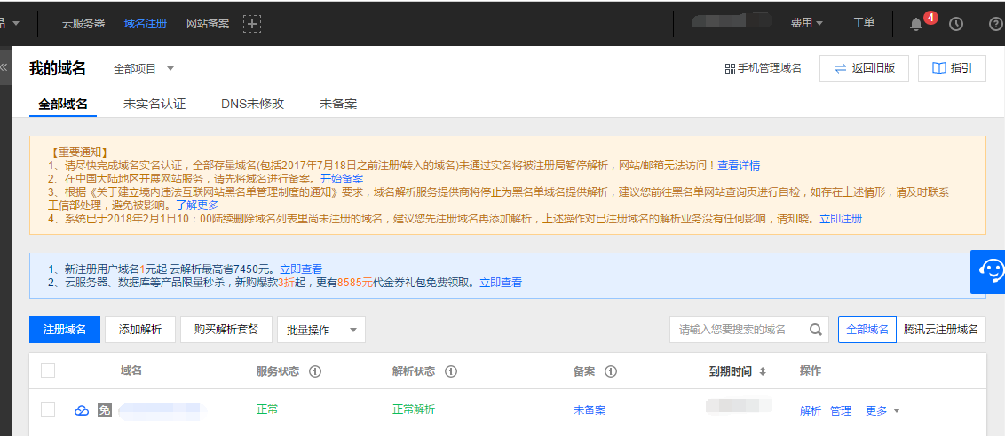 这里我用的是腾讯云的服务器。买了一个域名。没有备案的域名也可以使用。买完服务器进行域名解析。