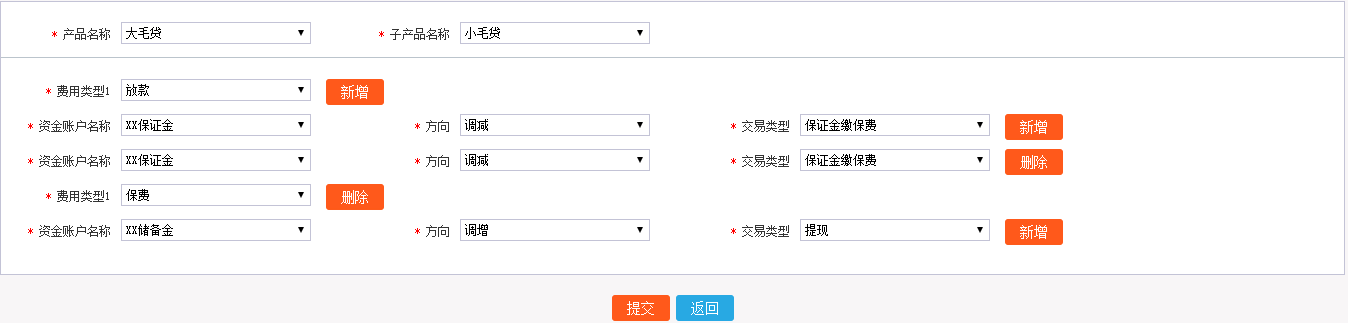 1.页面效果如下,第一个新增按钮增加的是,费用类型1和资金账户名称横向两栏这块,就称为Div块吧,第二个新增按钮增加的是,资金账户名称横向一栏,称为sonDiv块吧。第二个费用类型1和以下是新增出来的,所以显示是删除按钮,同样第二个资金账户名称也是新增出来的,所以也显示删除按钮。