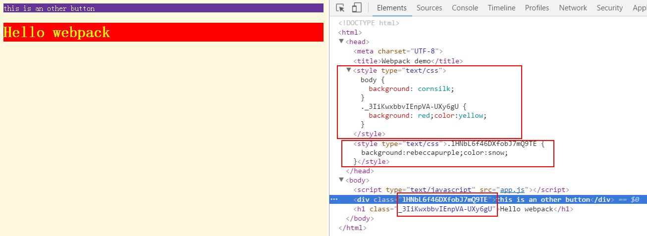 上面这个图说明了两问题,一个是我们在index.js中引入了2个样式文件,在index页面就输出了两个style,这让人有点不爽,但我们后面再解决。另外一个就是虽然两个样式文件中都有redButton这个类,但是这两者还是保持独立的。这样就避免了命名空间的相互干扰。如果你这个时候直接赋值