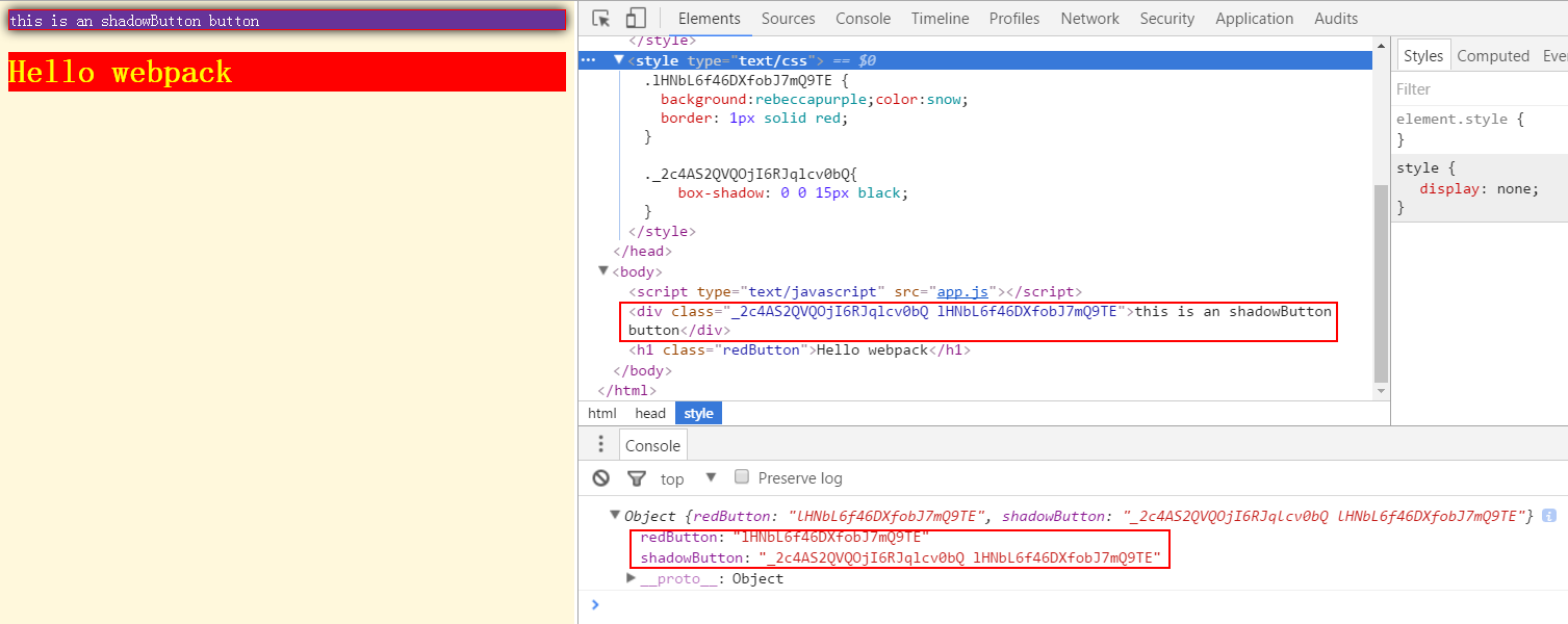 日志打印出来的是styles对象,它包含了两个类名。可以看见shadowButton是由两个类名组合而成的。div的class和下面的对应。
