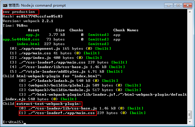 发现两个样式打包成了一个文件。只要内容发生了变化,样式的名称就会变化。更多配置可以移步https://www.npmjs.com/package/extract-text-webpack-plugin