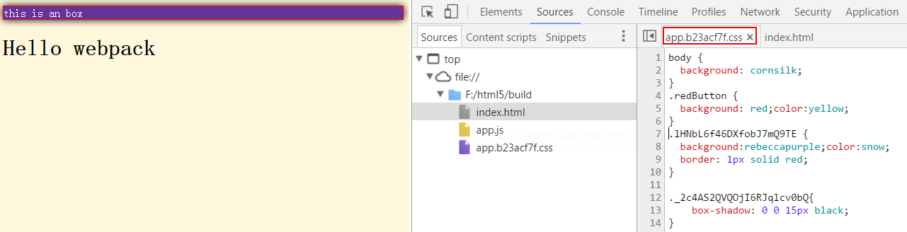 一开始看到这个配置,让人有点懵。首先看fileName,表示最后输出的文件按照这个格式'[name].[contenthash:8].css',name默认是对应的文件夹名称(这里是app),contenthash会返回特定内容的hash值,而:8表示取前8位。当然你也可以按照其他的格式写,比如直接命名: