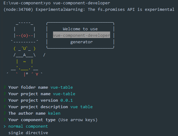 运行上面命令会弹出下面,依次输入对应的信息,到Your component type这一步可以选择对应的组件类型,有组件和指令两种模板,选择完成后输入对应的组件名称或者指令名称即可,例如我们声明的组件名为vue-table