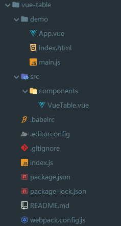 主要用来编写代码的文件有components/VueTable.vue和demo/App.vue,一个用来开发,一个用来测试,其他不需要管
