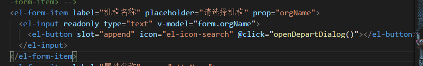 <el-form-item label="机构名称" placeholder="请选择机构" prop="orgName"> <el-input readonly type="text" v-model="form.orgName"> <el-button slot="append" icon="el-icon-search" @click="openDepartDialog()"></el-button> </el-input> </el-form-item>