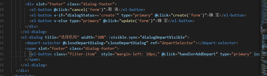 <el-dialog title="选择机构" width="30%" :visible.sync="dialogDepartVisible"> <depart-selector @closeDepartDialog="closeDepartDialog" ref="departSelector"></depart-selector> <span slot="footer" class="dialog-footer"> <el-button class="filter-item" style="margin-left: 10px;" @click="handlerAddDepart" type="primary" icon="edit">添加</el-button> </span> </el-dialog>
