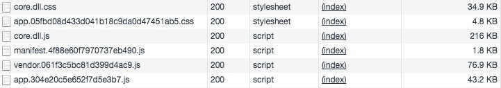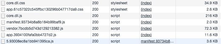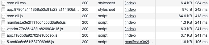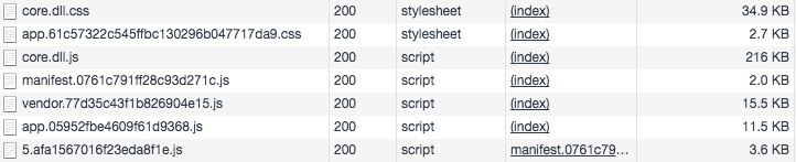 项目中多了core.dll.css和core.dll.js 他们就是划分出来的固定的,基本不变的模块,所以只需要编译一次,以后引用就好.有点library的感觉.这样每次构建省去了构建固定模块的时间. 时间有38s降到了10s,如果你构建比较频繁,应该还是很有用的.