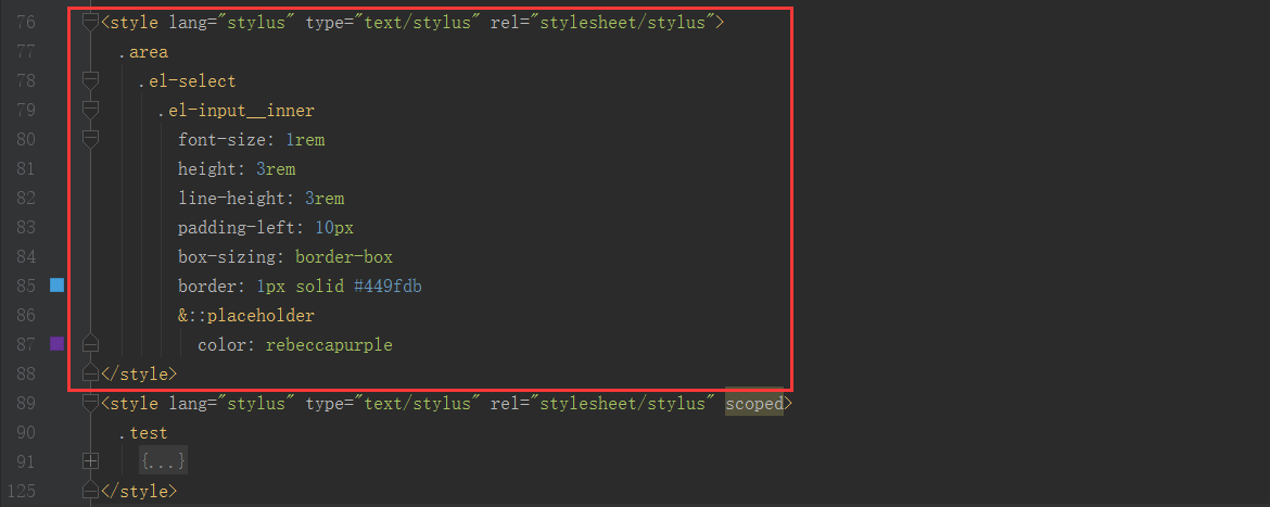 5.大家可以看到只是出现基本的效果,而样式看起来很不舒服,这是因为该插件的UI基于Element UI,所以如果需要使用样式需要依赖Element UI。但是很多情况下设计图的样式都是我们自定义的,此时可以自行修改样式代码,只需要在文件中写多一个公共的style文件修改对应的类名样式来覆盖之前的样式代码即可,需注意这个style文件不可以加上scoped,如下图红框所示:
