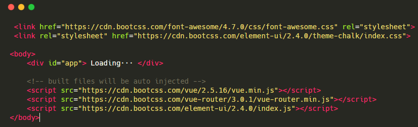 这样webpack就不会把vue.js, vue-router, element-ui库打包了。声明一下,我把main.js中对element的引入删掉了,不然我发现打包后的app.css还是会把element的css打包进去,删掉后就没了。