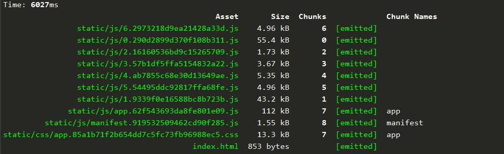 然后你打包就会发现,多了很多1.xxxxx.js;2.xxxxx.js等等,而vendor.xxx.js没了,剩下app.js 和manifest.js,而且app.js还很小,我这里是100k多一点。