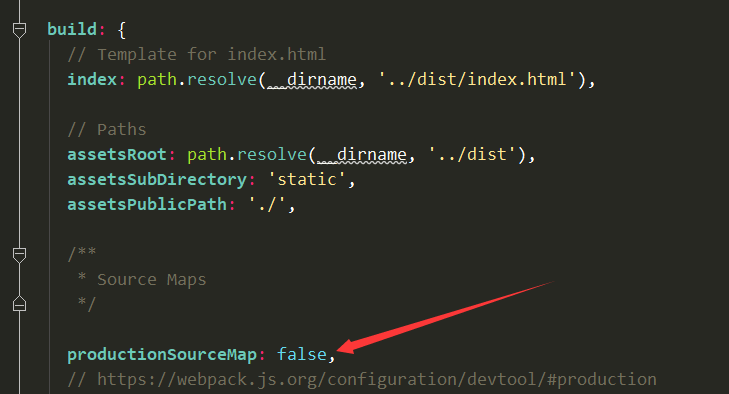 取消生成map文件,找到config/index.js ,修改下面箭头指向为false,就行了。