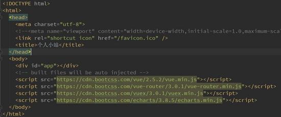 一个原则是尽量将比较大的第三方库放到cdn上去以减少请求时间,在我的项目中,我将vue,vuex,vue-router,echarts都放到了cdn上,具体操作是打开BootCDN 然后搜索关键字并copy链接粘贴到index.html的body闭合标签前,如下图