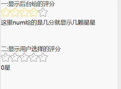 星级评分分成两种情况: 一:展示后台给的评分数据 二:用户点击第几颗星星就显示为几星评分;