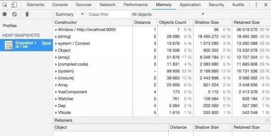 什么叫heap snapshot呢?翻译一下就是堆快照,给当前内存堆拍一张照片。因为动态申请的内存都是在堆里面的,而局部变量是在内存栈里面,是由操作系统分配管理的是不会内存泄露了。所以关心堆的情况就好了。