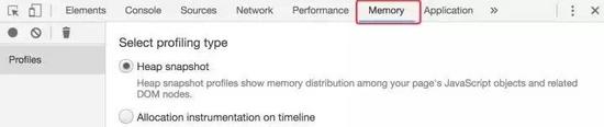 然后打开devtools,切到Memory的tab,选中Heap snapshot,如下所示: