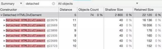 并且可以借助Chrome的内存分析工具进行快速排查,本文主要是用到了内存堆快照的基本功能,读者可以尝试分析自己的页面是否存在内存泄漏,方法是做一些操作如弹个框然后关了,拍一张堆快照,搜索detached,按distance排序,把非空的节点展开父级,找到标黄的字样说明,那些就是存在没有释放的引用。也就是说这个方法主要是分析仍然存在引用的游离DOM节点。因为页面的内存泄露通常是和DOM相关的,普通的JS变量由于有垃圾回收所以一般不会有问题,除非使用闭包把变量困住了用完了又没有置空。