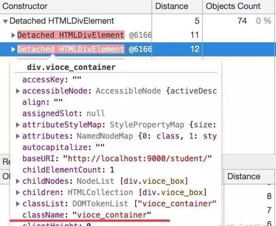 它就会显示所有已经分离了DOM树的DOM结点,重点关注distance值不为空的,这个distance表示距离DOM根结点的距离。上图展示的这些div具体是啥呢?我们把鼠标放上去不动等个2s,它就会显示这个div的DOM信息: