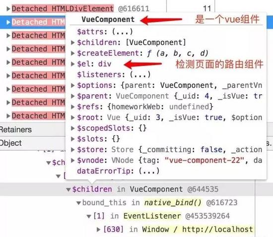 所以虽然Vue组件把DOM删除了,但是还有个引用存在,导致组件实例没有被释放,组件里面又有一个$el指向DOM,所以DOM也没有被释放。