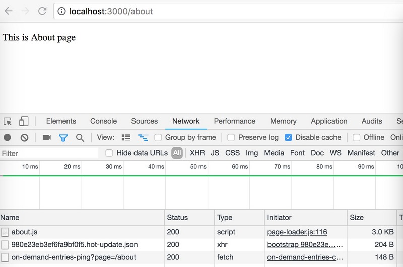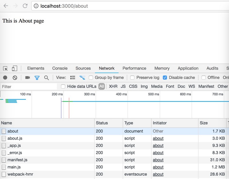 这样点击index页面的AboutPage链接就能跳转到about页面,而点击浏览器的返回按钮也是通过前端路由进行跳转的。 官方文档说用前端路由跳转是不会有网络请求的,实际会有一个对about.js文件的请求,而这个请求来自于页面内动态插入的script标签。但是about.js只会请求一次,之后再访问是不会请求的,毕竟相同的script标签是不会重复插入的。 但是想比于后端路由还是大大节省了请求次数和网络流量。前端路由和后端路由的请求对比如下: