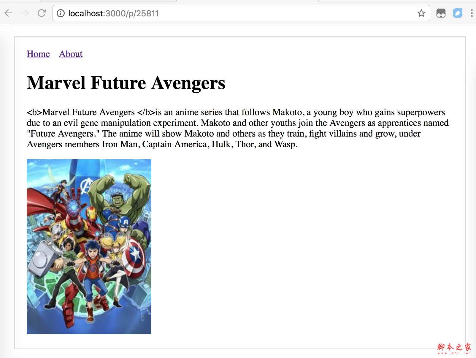 重启项目(修改了server.js的内容需要重启),从列表页进入详情页,已经成功的获取到电视节目的详情并展示出来:
