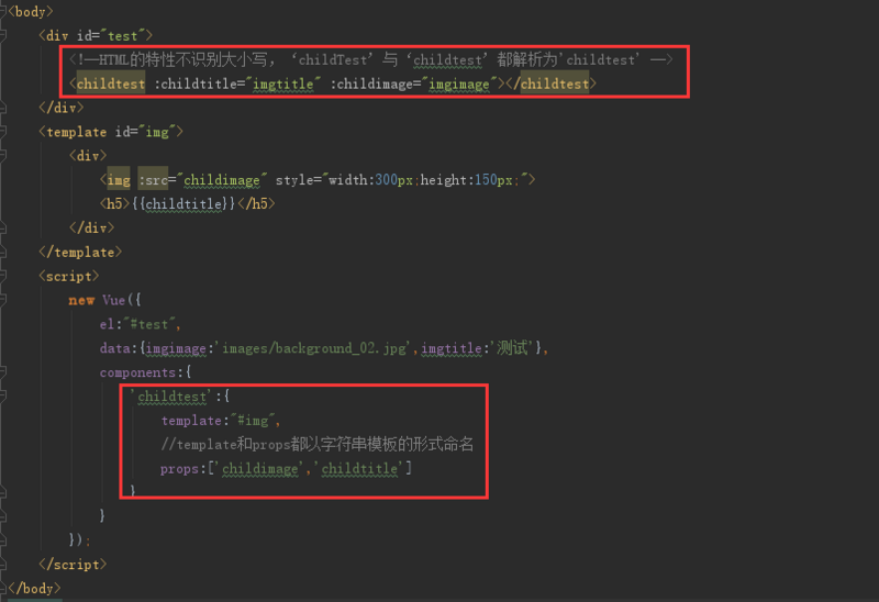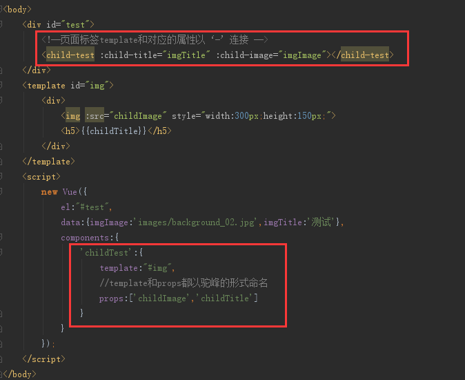 1、当组件中template及props等使用驼峰式命名,在html中对应的改成短横线命名方式。