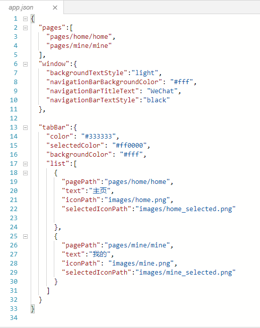 1、在pages属性中配置项目所有的页面路径,我们这个例子就两个,home,mine
