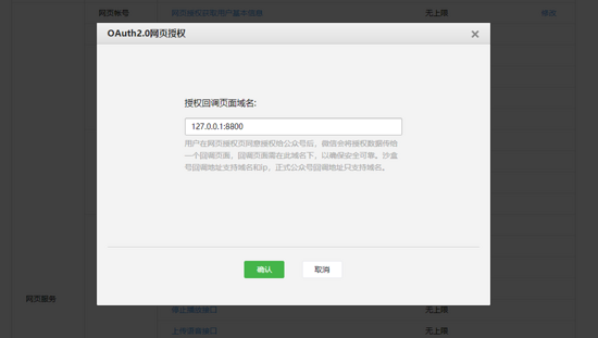 登陆测试号后可以查看到自己的appId和appsecret信息,将体验接口权限表里的网页服务的网页授权获取用户基本信息修改为127.0.0.1:8800,该地址就是用户确认授权后回调的地址即我们应用的后台处理地址,如下图