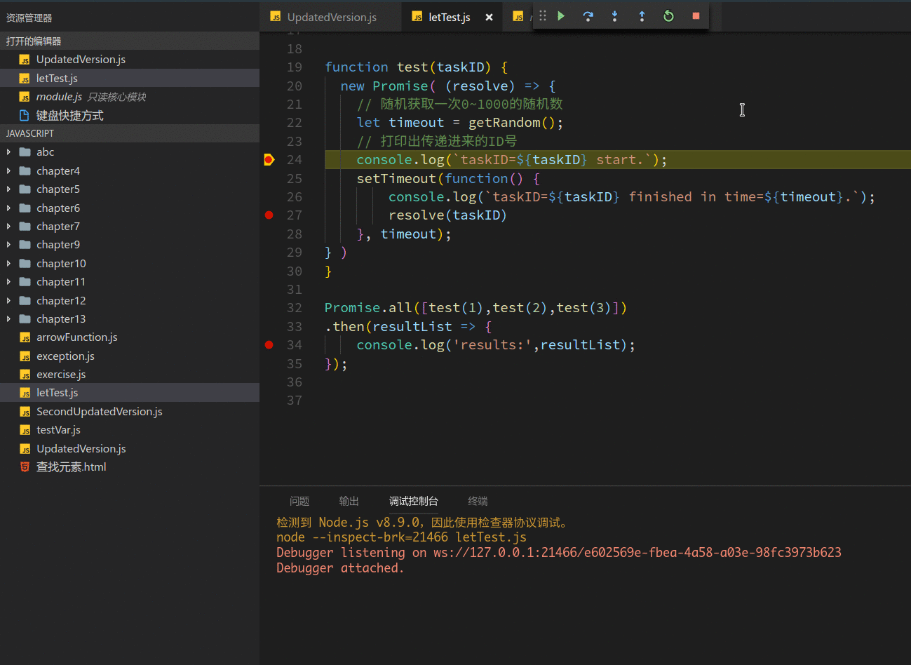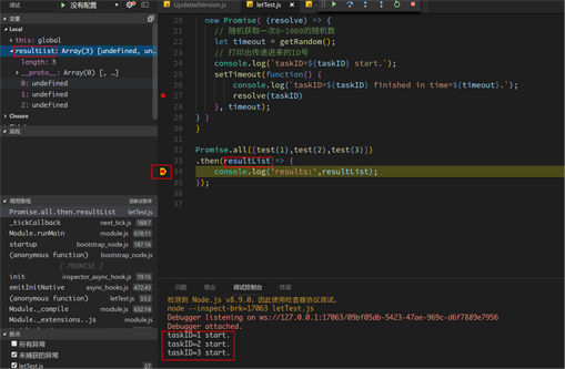 根据上图我们可以看出console.log(taskID=${taskID} start.)每次都会被执行,setTimeout也会被执行,但是3次之后,就会直接开始执行.then(),所以我们找到了原因,Promise.all()这时并没有等待返回完整的数据就执行了.then(),没有等到resolve就开始执行了。
