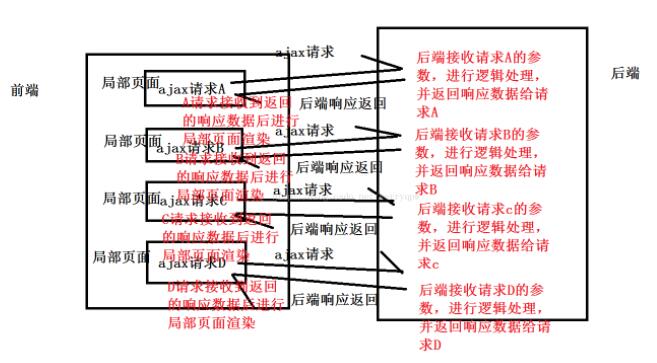 Ajax是通过http,使得JS与后端进行数据通信,由于Ajax的异步特性,可以使多个Ajax请求同时访问后端,对页面的局部数据进行逻辑处理,并渲染。