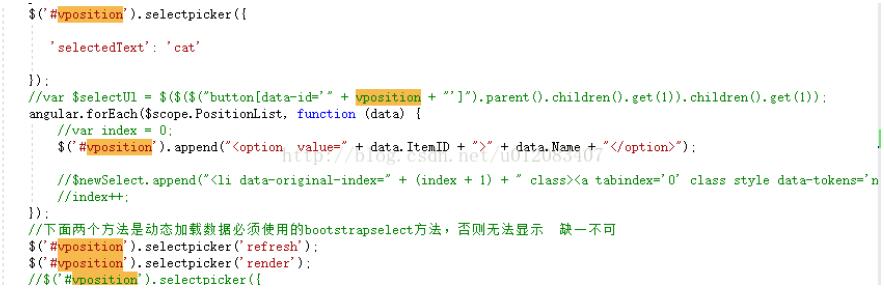 在使用bootstrap-select 动态加载数据的时候,refresh和render方法是必须使用的,不然就必须使用jquery往li对象里面填充数据,因为在bootstrap-select 中界面显示数据是通过li对象显示的,而select对象只是用于填充数据的,所以不要搞混了
