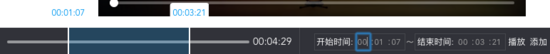 非编辑状态,鼠标在进度条上移动时,监听 mousemove 事件,在接近任意一条裁剪数据的开始或结束时间戳时高亮当前数据并显示时间戳。鼠标 mousedown 后选中时间戳并开始拖拽更改时间数据。 mouseup 后结束更改。
