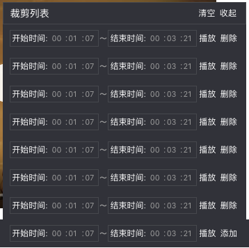 既然是多段裁剪,那么用户得知道裁剪了哪些时间段,这通过右侧的裁剪列表来呈现。