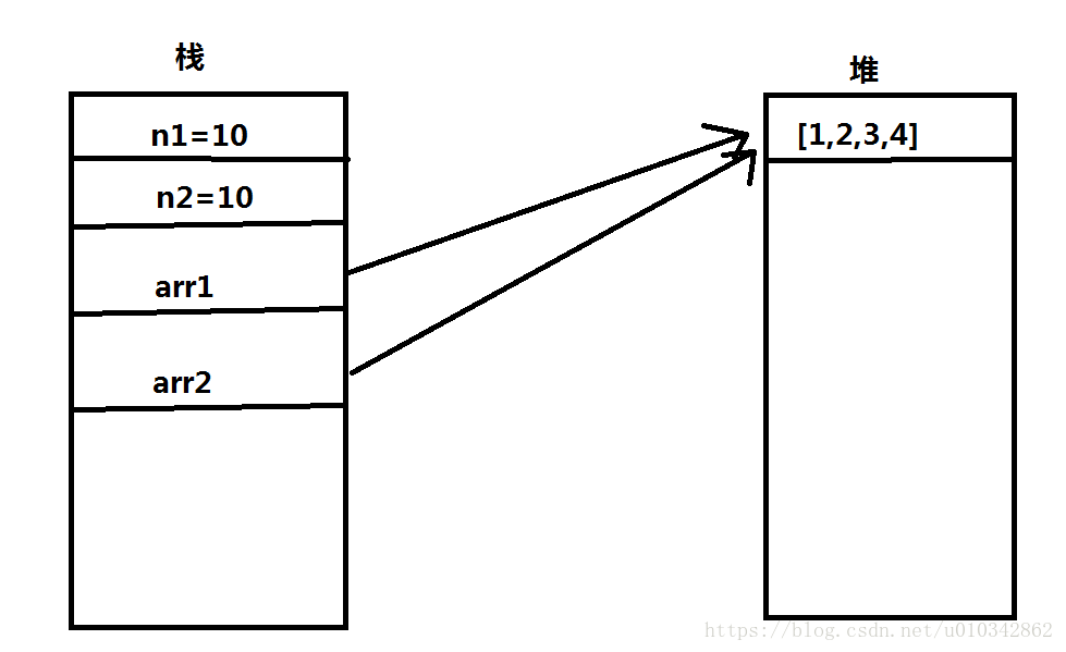值类型是在栈中直接保存的变量的实际值,而引用类型在栈中仅仅保存的是变量指向堆中的地址,从上图中可以看出,值类型的变量n1和n2都是10,但是在栈中却为这两个变量分别开辟了两块空间来存储,而引用类型的变量arr1和arr2也相同,但是在堆中仅仅开辟了一块内存来存储,而在栈中存储的是这两个变量指向堆中的地址,这两个变量都指向堆中的同一片地址。