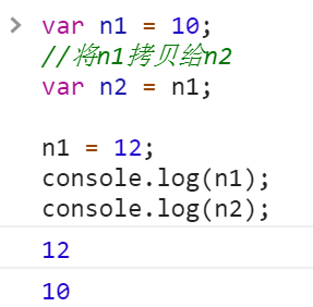 var n1 = 10; //将n1拷贝给n2 var n2 = n1; n1 = 12; console.log(n1); console.log(n2);