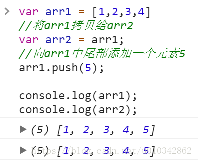var arr1 = [1,2,3,4] //将arr1拷贝给arr2 var arr2 = arr1; //向arr1中尾部添加一个元素5 arr1.push(5); console.log(arr1); console.log(arr2);