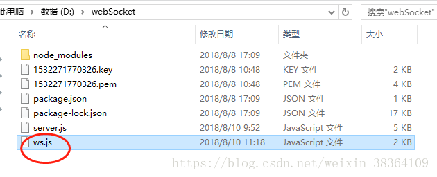 3.安装好模块后,在你目录下创建一个.js文件,我这是一个ws.js