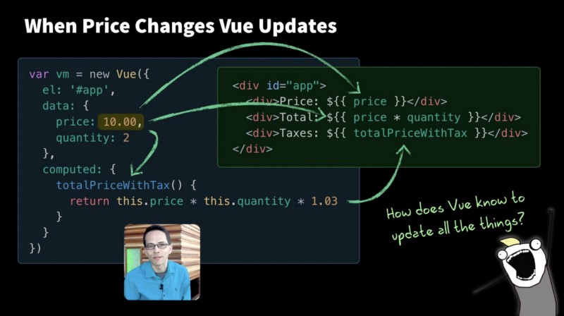 但是等等,你应该会觉得奇怪,当价格变化时,Vue如何知道要更新什么,以及它如何跟踪所有内容?