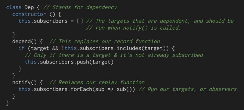 因此,如果我们创建一个JavaScript类来管理我们的依赖项(它更接近Vue处理事物的方式),它可能看起来像这样: