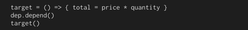 当像这样的一段代码运行并获得价格的价值时,我们希望价格记住这个匿名函数(目标)。这样,如果价格变化,或者设置为新值,它将触发此函数以重新运行,因为它知道此行依赖于它。所以你可以这样想。